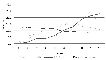 Por tanto, el comportamiento de las transferencias en salud ha evolucionado de manera positiva en los últimos años, destacando sobre todo la cobertura proporcionada por los servicios del la ss. De hecho, estos servicios son los responsables en gran medida de los buenos resultados del sector salud, ya que instituciones como el issste muestran un comportamiento más bien nulo en su cobertura de los estratos económicos más bajos. Por su parte, el imss también ha mejorado la progresividad de sus servicios, aunque en menor medida que los de la Secretaría de Salud.