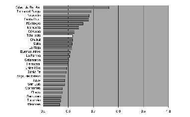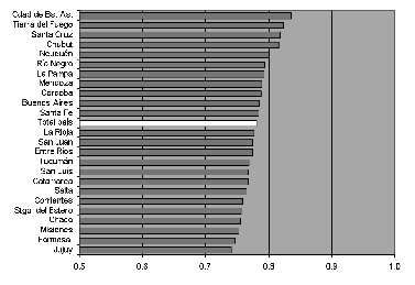 La medición territorialmente desagregada del componente económico del idh plantea el doble desafío de evaluar el nivel de ingresos disponible en cada entidad espacial y el grado de concentración o dispersión con que el mismo se distribuye. Sólo la captación de ambos elementos permite obtener un panorama más o menos preciso de las posibilidades reales de acceso a recursos materiales por parte de una determinada población. Con el objetivo de reflejar el primero de esos aspectos se seleccionó la variable ingreso per cápita de los hogares; para el segundo se identificaron tres indicadores: 1) tasa de desocupación, 2) tasa de sub-ocupación horaria y 3) porcentaje de personas en la línea de pobreza.