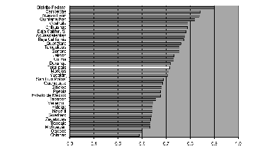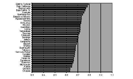 Un panorama marcadamente distinto se configura en países como Brasil y México que, según la clasificación del pnud, arrojan un nivel de desarrollo humano inferior al de Chile y Argentina. En las series de datos obtenidas, la desviación estándar de la tasa de alfabetización de adultos alcanzaba 8.6 en Brasil y 4.8 en México. En el primer caso, la medida indica la alta heterogeneidad con que se distribuye la alfabetización entre los estados. Para el año 2003 el indicador registraba un valor nacional de 88.4%, y valores extremos de 71.6 y 95%. En México, que presentaba en 2004 una tasa de alfabetización de 91.5%, los valores mínimo y máximo a nivel estadual fueron de 81.2 y 98.2 por ciento.