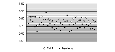 Finalmente, el indicador utilizado en el idh-pnud para medir la dimensión nivel de vida (pib per cápita), no se sometió a análisis de sensibilidad territorial por no contar con información estadística suficiente para su elaboración a escala desagregada, pero asimismo porque no se considera una medida válida para reflejar la capacidad que con él se pretende evaluar.[4]