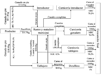 Según la teoría de comercialización, el proceso de mercadeo está orientado a satisfacer las necesidades del consumidor, y al ser éstas compensadas se obtiene un margen de ganancia (Abbot, 1987: 183). El agente de comercialización es cualquier individuo o persona jurídica que añade utilidad al producto, y su participación puede ser directa o indirecta (Caldentey, 1986: 19). Para determinar los mbc fue necesario identificar los canales de comercialización, los cuales muestran el rol que desempeña cada agente y las etapas por las que pasa el producto, desde el productor hasta el consumidor mediante relaciones de compra-venta (Mendoza, 1991: 197). El esquema de comercialización tradicional de bovinos está desarticulado y disperso (Ruiz et al., 2004: 13, 27; Márquez et al., 2004: 122), de manera que la participación de agentes intermediarios es esencial para su funcionamiento (Bravo et al., 2002: 256), que en ocasiones es de un mínimo de tres (fira, 2003: 16).