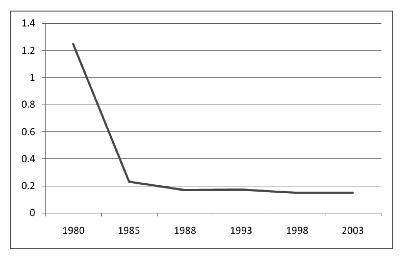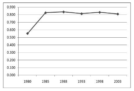 [7] Este dato, correspondiente a 1980, se debe considerar con cautela, ya que es posible que no sólo se deba al comportamiento de la producción, la inversión y el empleo, sino que probablemente esté influido por problemas de captura de datos y de contabilidad, como documenta Esquivel (1999) respecto a la contabilidad que se llevó a cabo de la producción petrolera del golfo de México en las décadas de 1970 y 1980. Además, en esos años los vaivenes de los precios del petróleo −dice Esquivel− sin duda también afectaron la producción y el ingreso de los estados petroleros.