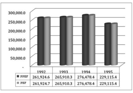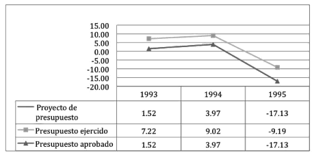 [18] Por ejemplo, para 1992 la iniciativa contempló 261,924.6 millones de pesos, y fue aprobada por la misma cantidad; este comportamiento fue constante durante el periodo de estudio.