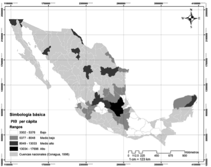 La estructura del análisis responde al siguiente orden: a) de un total de 159 cuencas registradas por la Comisión Nacional del Agua (Conagua, 1998), se consideran 45 debido a que en ellas se genera 92.85% del pib del país, es decir, se elige una muestra donde se concentra la mayor demanda de recursos y se reproduce un creciente estado de vulnerabilidad social; b) se identifican los sectores de la actividad económica predominantes en las cuencas de estudio para estimar la demanda efectiva, y c) se estiman los factores que modifican el sistema hídrico, particularmente la extracción de agua y la sustitución de usos del suelo.