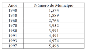 criados 315 novos municípios, na década de 1950 foram criados 877, na década de