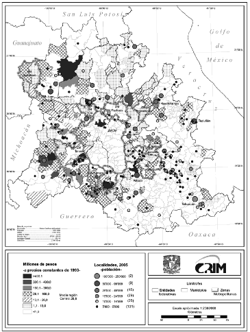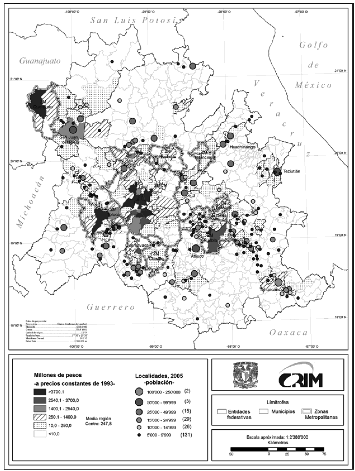 [7] Estos 12 municipios corresponden a los comprendidos en los dos primeros rangos de la clasificación de municipios de acuerdo al pib que aportan al sector primario. De ellos, nueve aportan un pib que va de 430,000 a 2.1 millones de pesos de 1993 (rango uno), y tres aportan un pib de 295,000 a 430,000 pesos (rango dos). En total, se obtuvieron siete rangos que se aprecian en el cuadro 1.