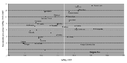 Península de Yucatán, rangos y crecimientos porcentuales de los componentes del idhp en los periodos 1995-2000 y 2000-2005