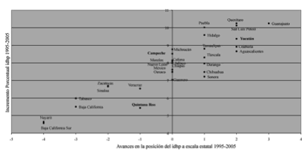 Durante el decenio de análisis, de las 32 entidades que conforman la República Mexicana, 14 mejoraron su clasificación, entre ellas Campeche. En 1995 se ubicaba en la posición siete, con una ev de 74.44 años, superior a la nacional (72.58). El aumento de 1.96 años durante el quinquenio 1995-2000 le fue suficiente para alcanzar el lugar tres, donde se mantuvo hasta 2005, en el cual su expectativa de vida era de 76.18 años; llama la atención que para ese mismo año Campeche era el estado de la península con el mayor número de centros de salud, aunque también el que tenía menos médicos (ss, 2006), haciendo difícil inferir si la atención médica coadyuva en el avance de la ev.