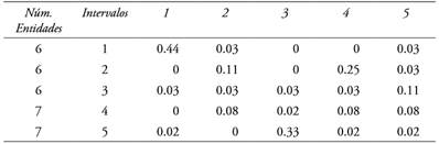 La interpretación de la tabla 7 nos dice que para las entidades maquiladoras hay 60% de probabilidades de permanecer en el primer intervalo (proporción bastante alta comparada con el resto), 20% de transitar hacia el segundo intervalo y 20% hacia el intervalo cuatro; así sucesivamente, el resto de los rangos en productividad donde nuevamente la diagonal principal reafirma que hay más probabilidades de permanecer en el nivel de productividad inicial.