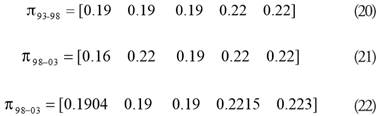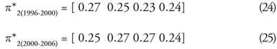 Dado que la ime aporta datos mensuales, para evaluar de 1996 a 2006, se procedió a obtener un promedio anual para tres cortes en el tiempo; las cadenas de Markov se realizaron de 1996-2000, 2000-2006 y 1996-2006.[11] El vector de estado inicial y las matrices de transición se muestran a continuación.