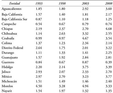Fuente: elaboración y cálculos propios con base en datos de INEGI (1994, 1999, 2004, 2005 y 2009).