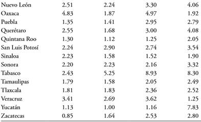 Para la maquiladora no se cuenta con una base de datos homogénea de participación de las entidades,[10] sin embargo fue posible realizar el mismo ejercicio de dinámica de distribución, lo importante es identificar si la maquiladora presenta el mismo comportamiento que la industria en general.