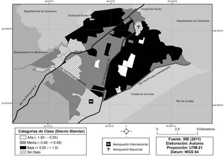Posteriormente, se procedió a realización del índice de estratificación socioeconómica en función de las carencias básicas que presenta la población para este conjunto de variables. En este sentido, se le asignó mayor valor a: i) los niveles más bajos de educación; ii) si los materiales constitutivos de la vivienda están basados en elementos precarios; iii) si existe ausencia de los elementos de confort, y iv) si la condición de la actividad económica es desfavorable (trabajo). Finalmente, para poder visualizar de forma más clara los resultados, se elaboraron tres categorías cualitativas (bajas, medias y altas), con base en la desviación estándar.